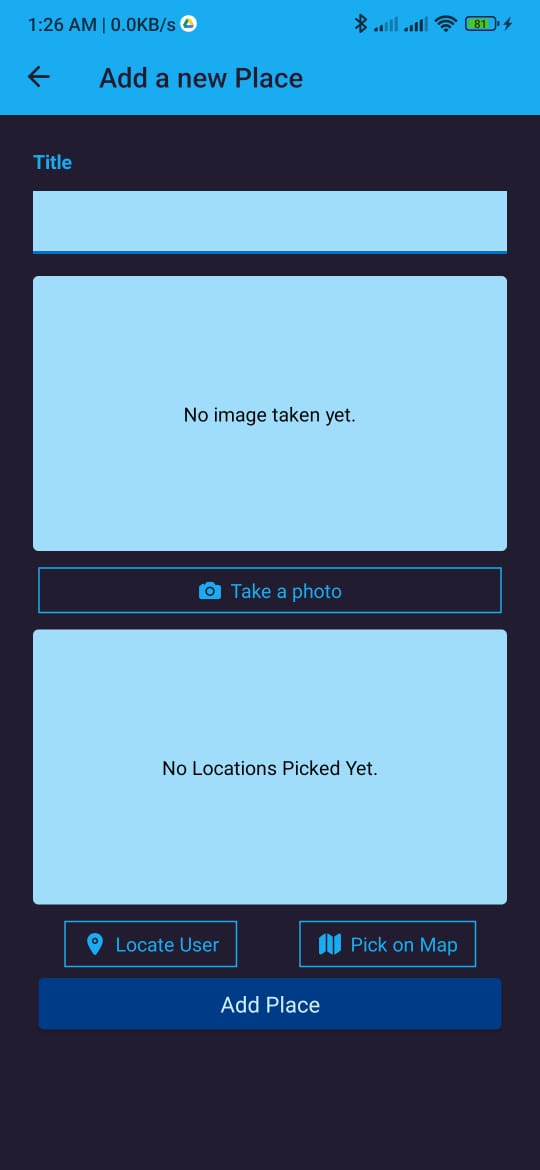 A location-based React Native app using maps and camera integration, allowing users to save favorite spots. Users can capture photos, select locations via map or GPS, and save them with titles. Features include an interactive map view and local data storage using SQLite.